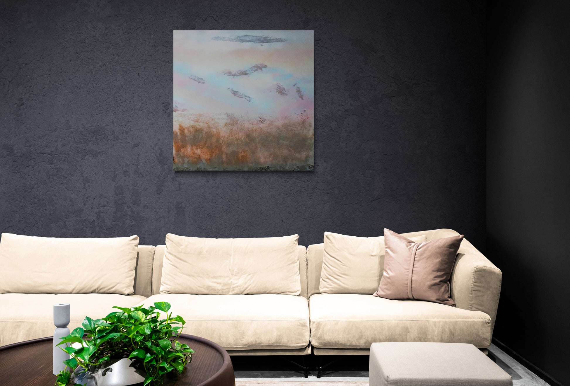 An abstract landscape created using chalk, sand and spray paint on box canvas.