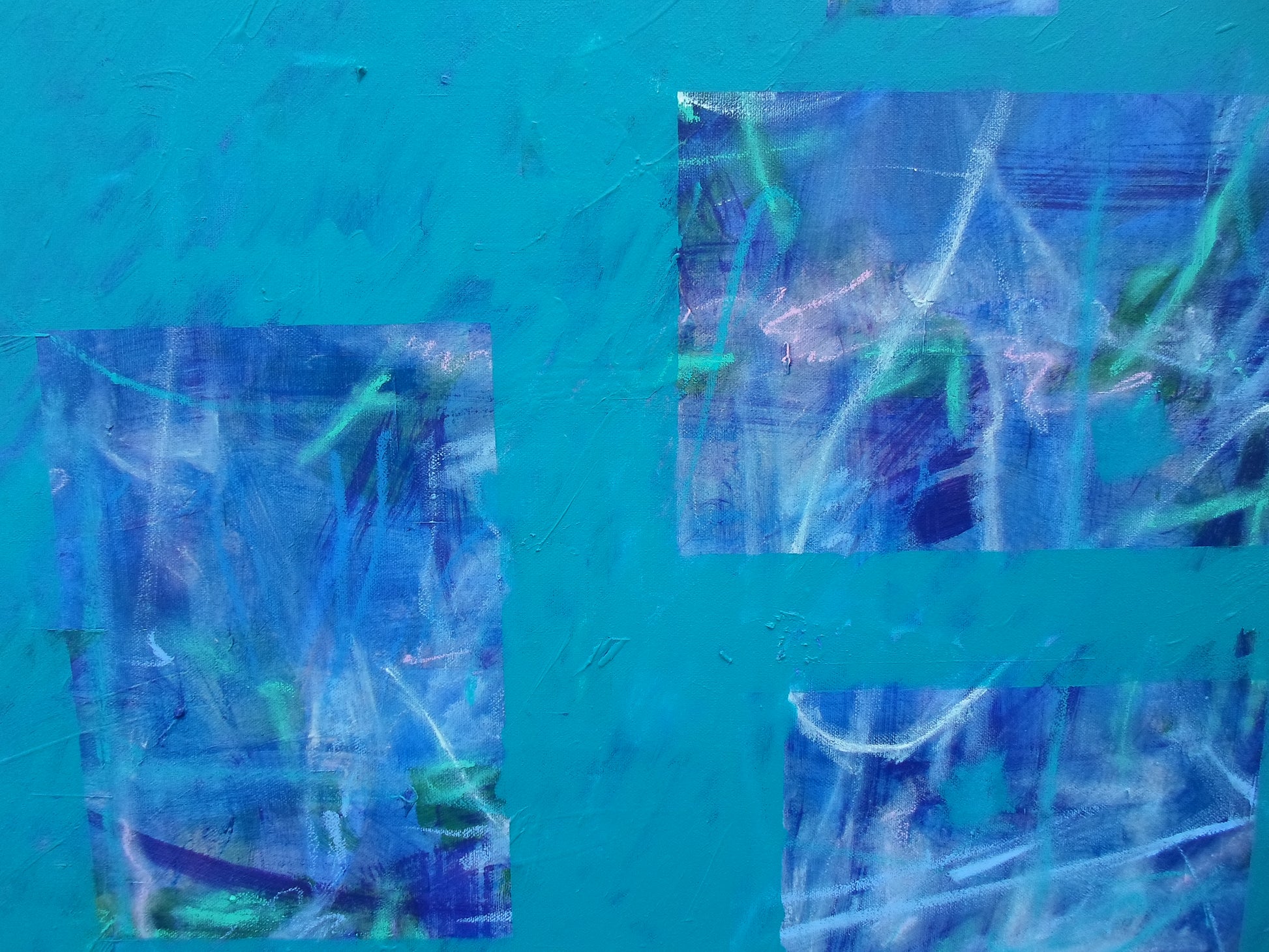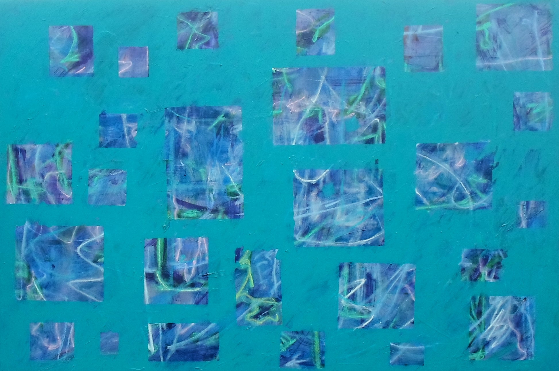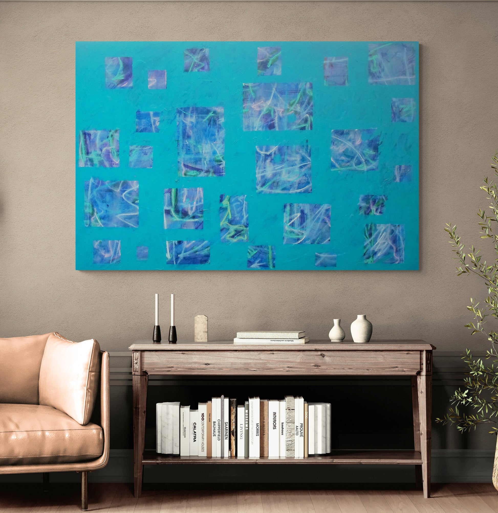 This large-scale abstract painting (100 x 150 cm) explores the dynamic interplay between geometric structure and expressive color. The composition is anchored by a series of translucent squares and rectangles, rendered in layered shades of blue and green, set against a vibrant turquoise background. The surface treatment, with its visible brushwork and subtle textural variations, invites close inspection and rewards repeated viewing.