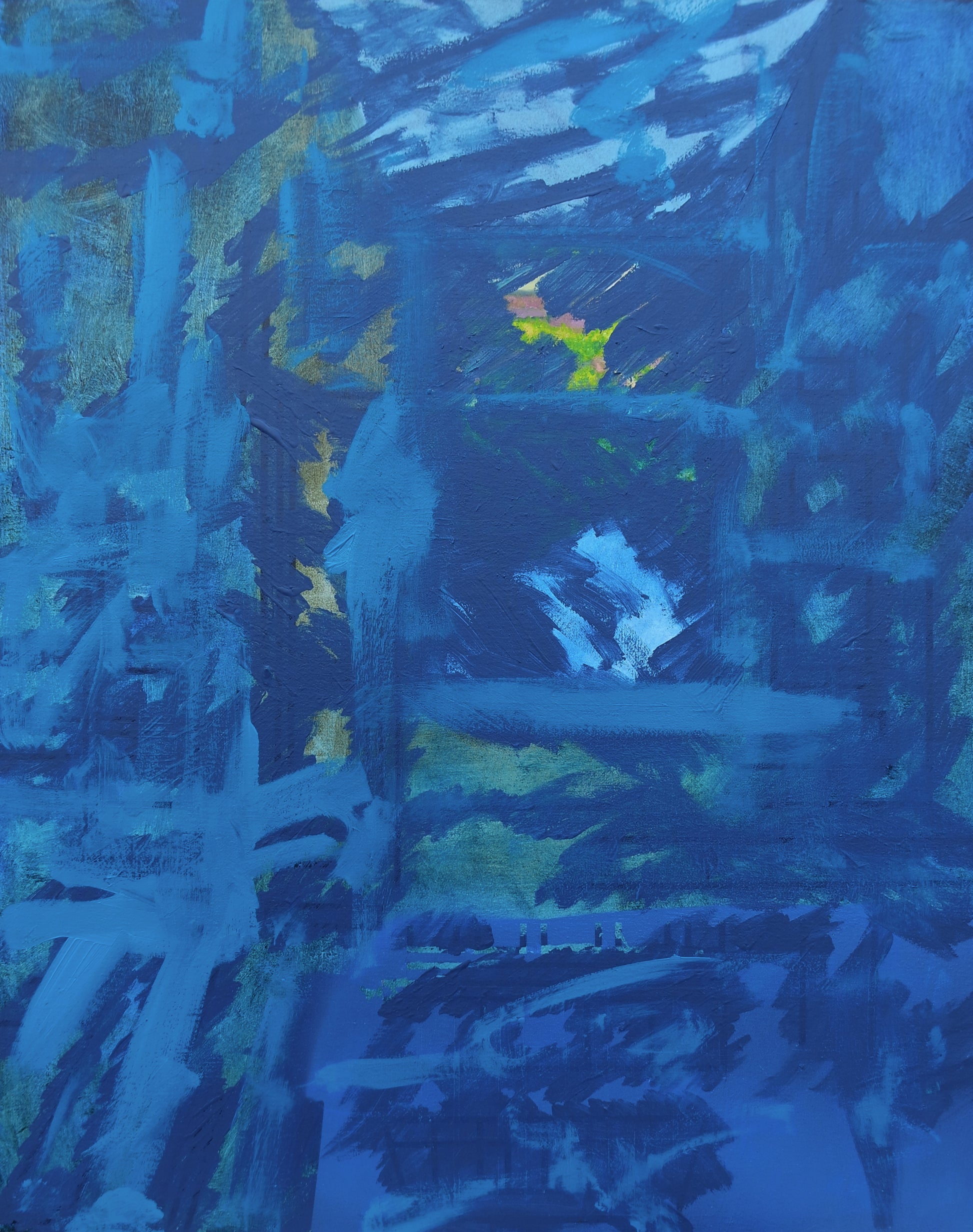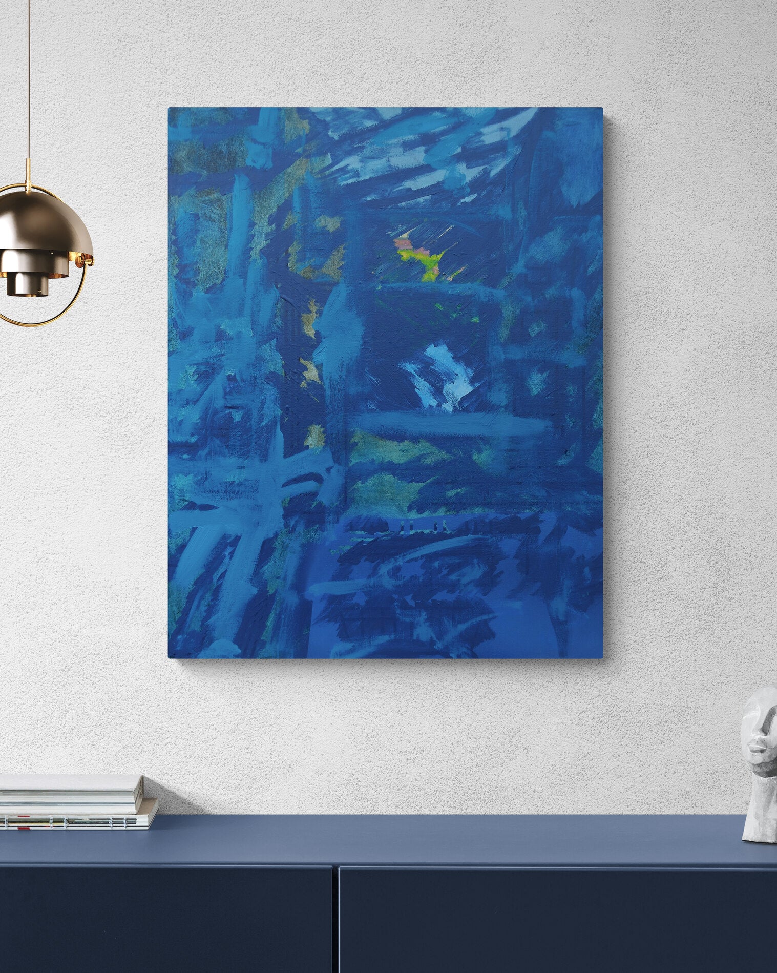 This abstract artwork immerses the viewer in a rich tapestry of blue hues, where layers of texture create a sense of depth and movement. The interplay of darker and lighter shades evokes a dynamic emotional landscape, inviting contemplation and reflection. Subtle hints of green and gold peek through, adding complexity and intrigue to the composition. This piece serves as a striking focal point, perfect for enhancing any space with its expressive energy.