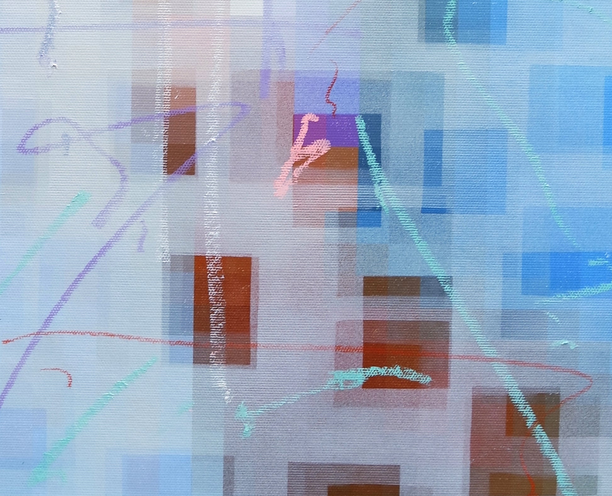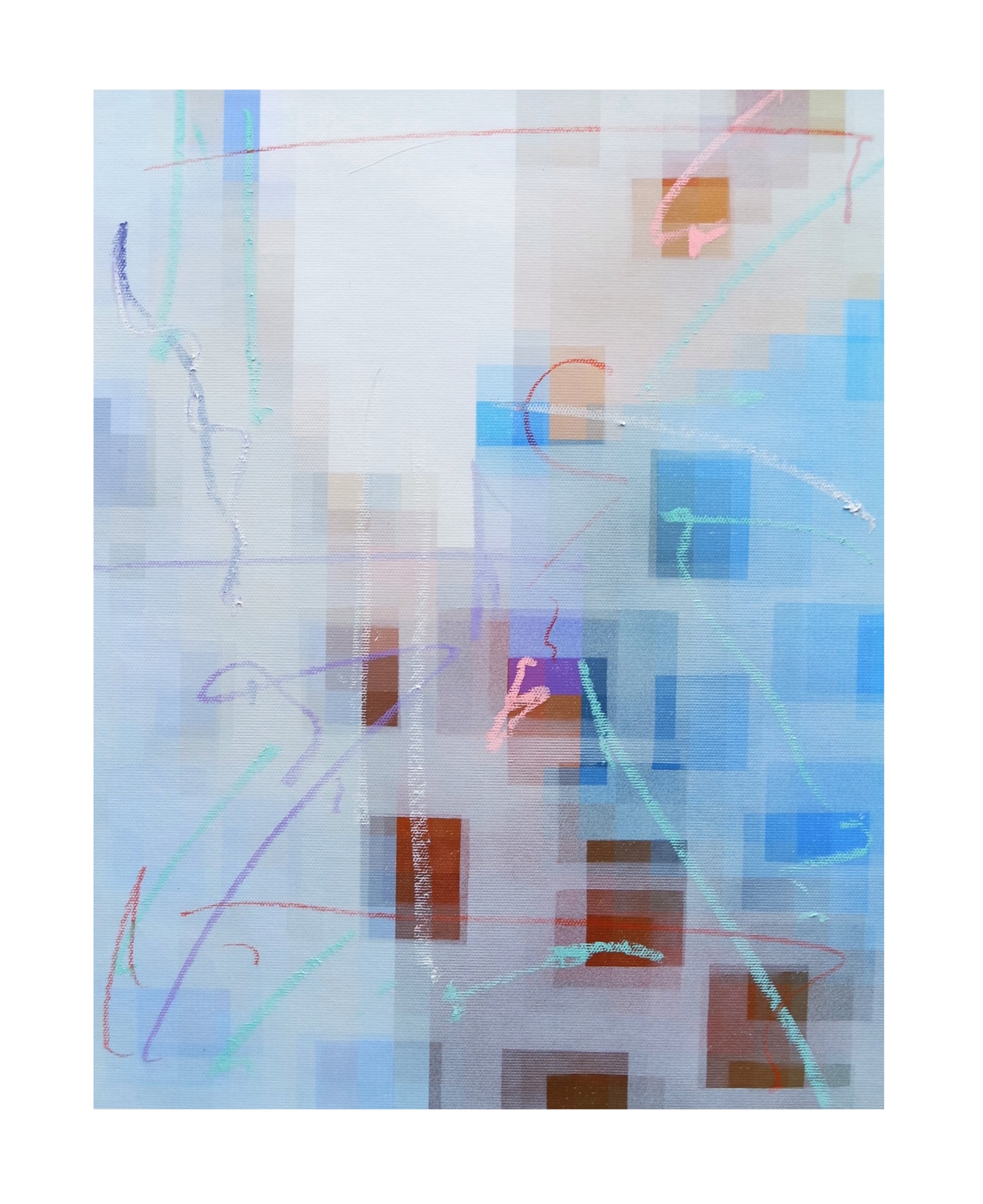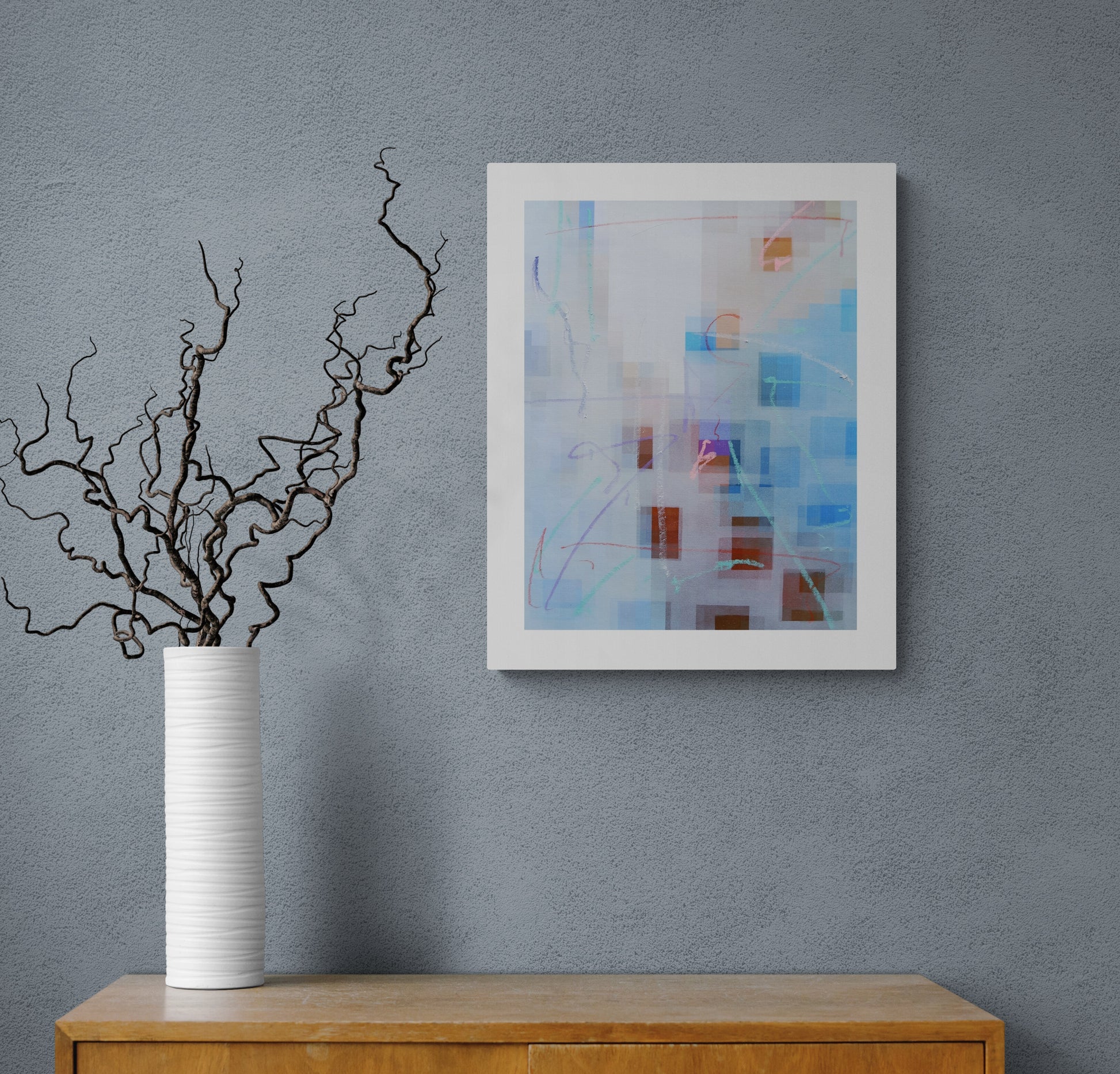 This artwork presents a dynamic interplay of color and form, featuring a mosaic of pixelated shapes that evoke a sense of digital abstraction. Soft blues and warm oranges blend seamlessly, while delicate lines weave through the composition, adding a layer of movement. The juxtaposition of geometric elements invites contemplation, making it a striking addition to any modern space.
