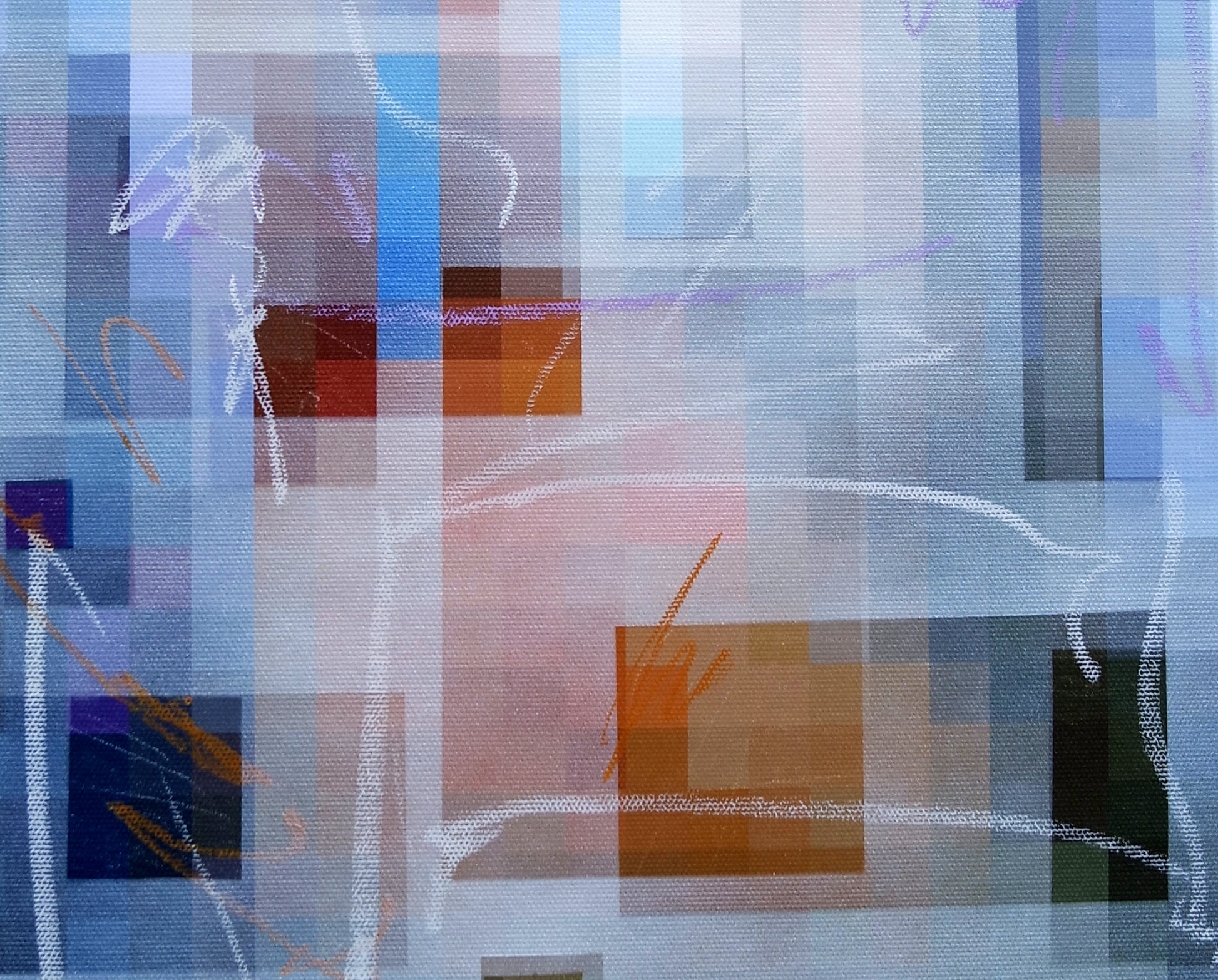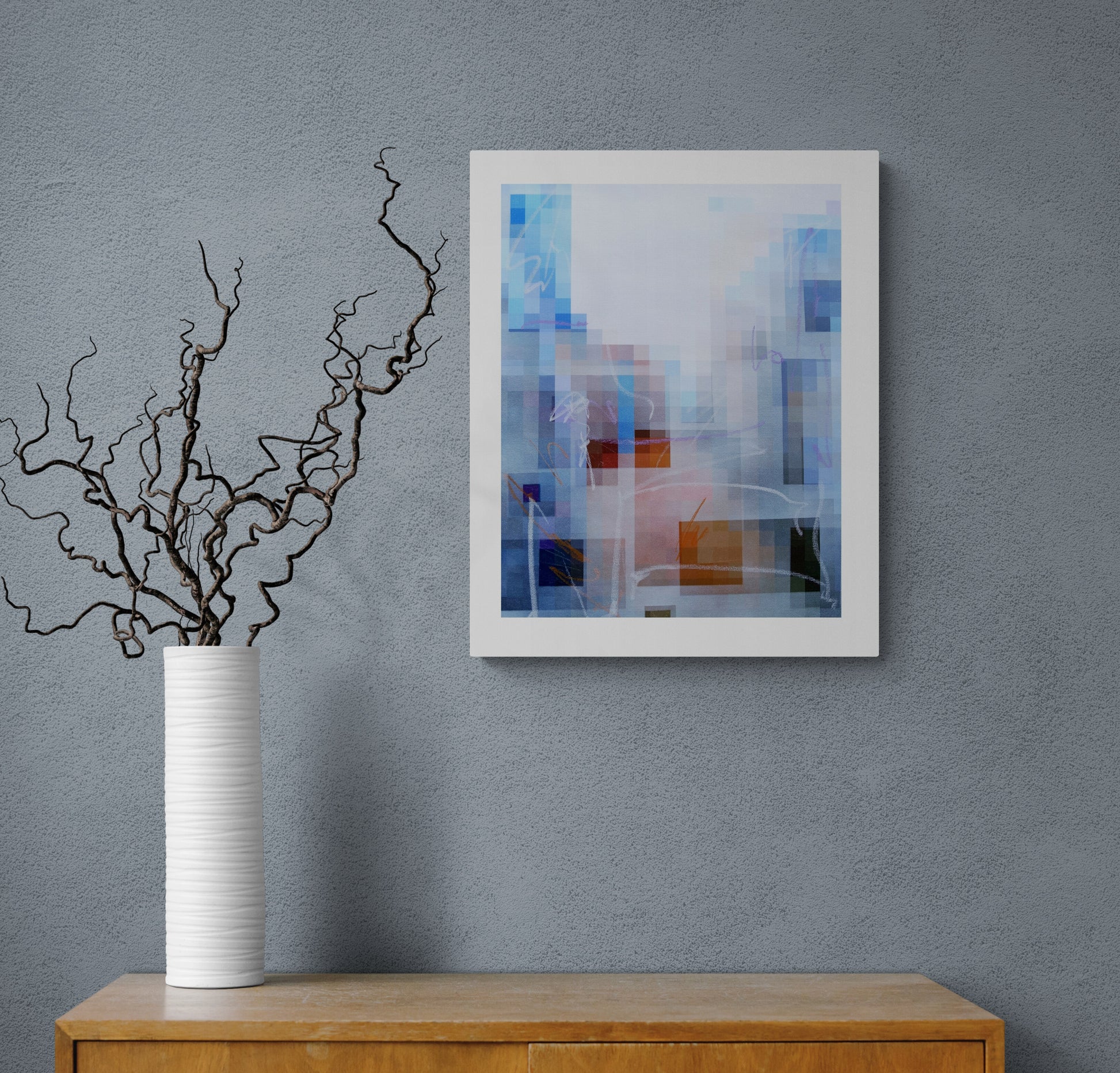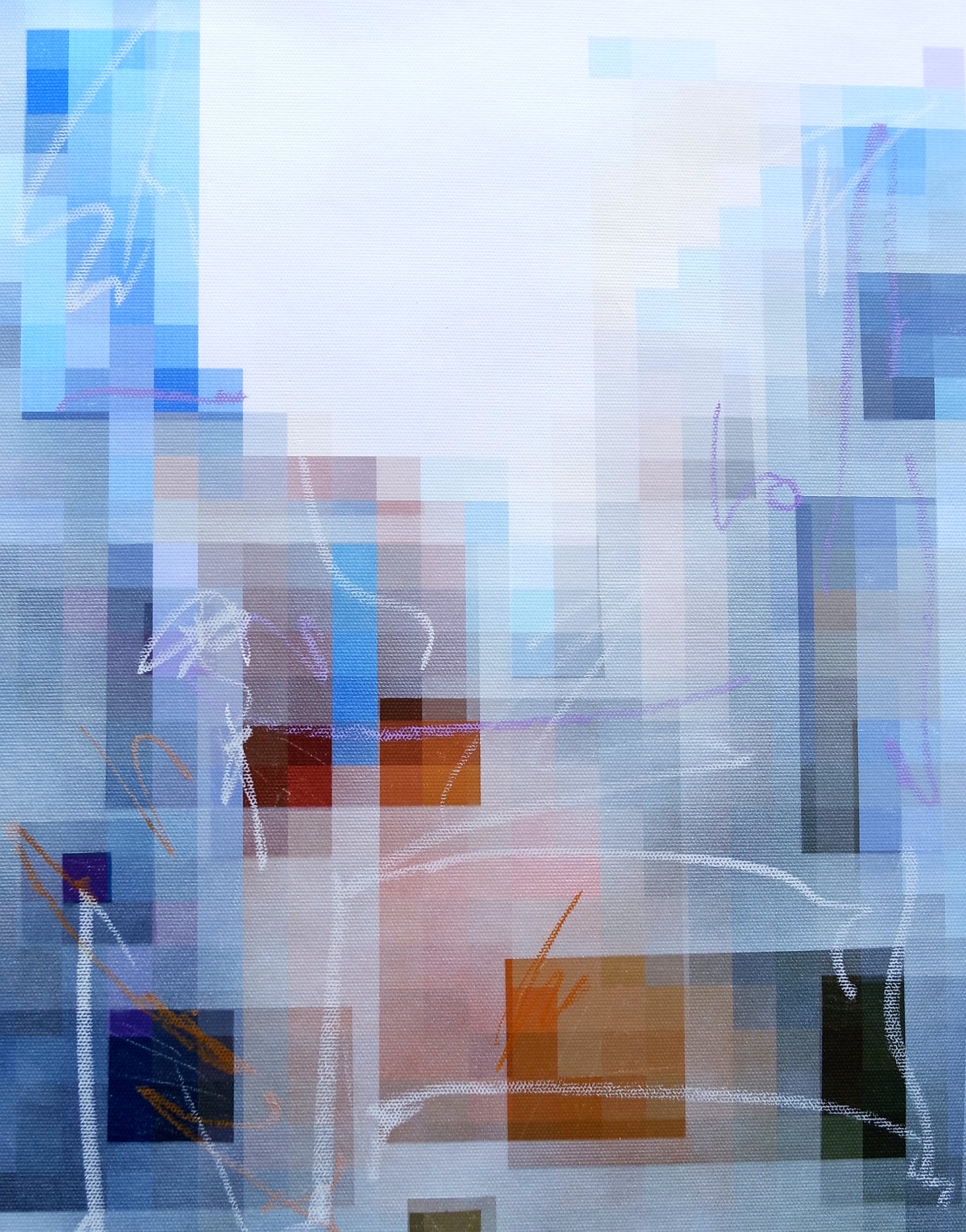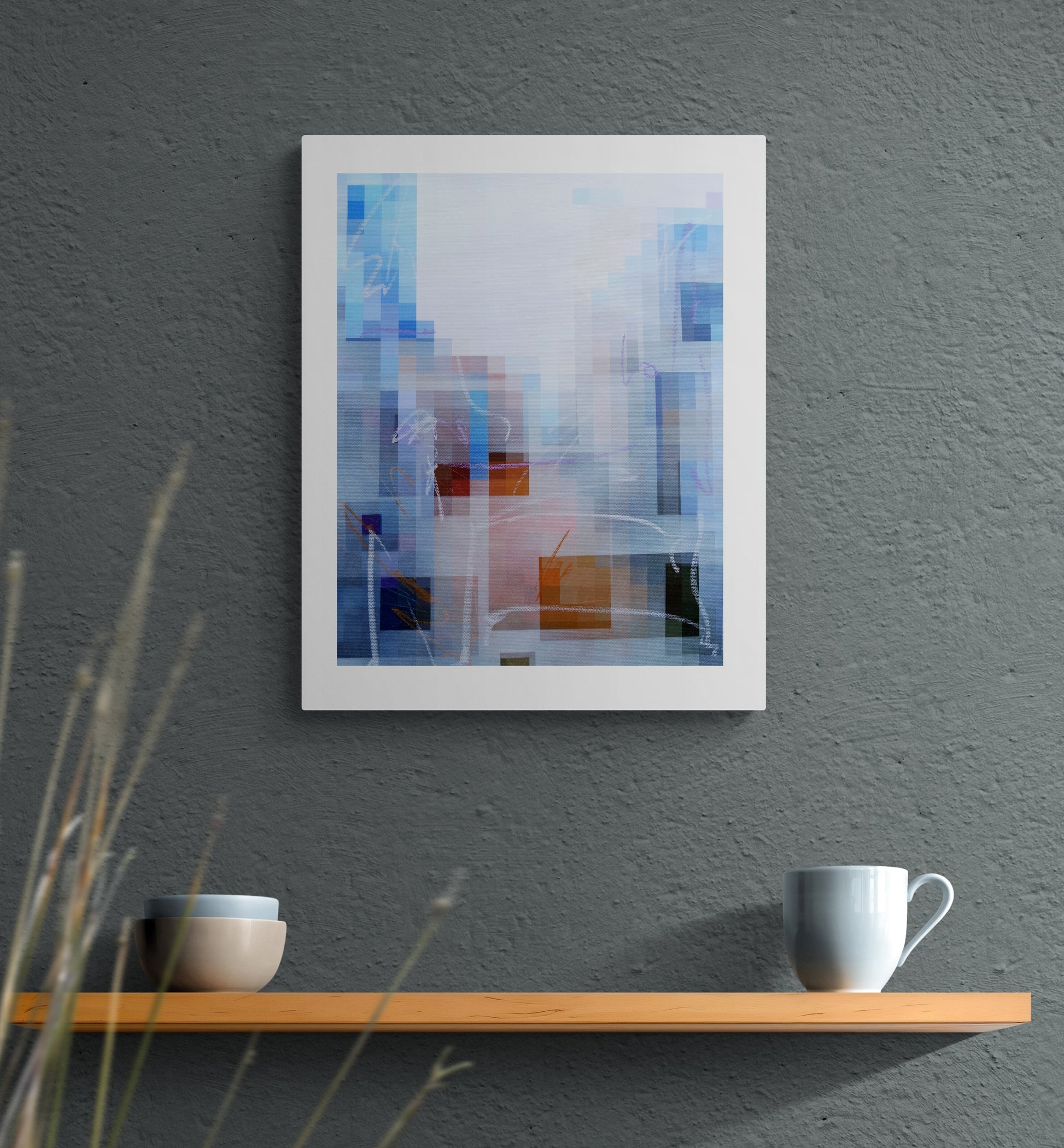 This artwork presents a dynamic interplay of color and form, featuring a mosaic of pixelated shapes that evoke a sense of digital abstraction. Soft blues and warm oranges blend seamlessly, while delicate lines weave through the composition, adding a layer of movement. The juxtaposition of geometric elements invites contemplation, making it a striking addition to any modern space.